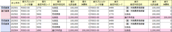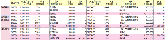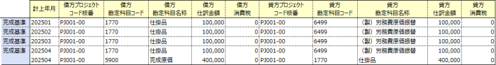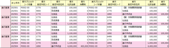 < FAQトップへ Top システム管理者向け 進行基準仕訳はどう出力される? 進行基準仕訳はどう出力される? 期間が4か月のプロジェクトについて、各月ごとの計上区分(完成基準/進行基準)と仕訳のサンプルを下記に示します。ご参考ください。 1.完成基準のプロジェクト 2.進行基準のプロジェクト 3.完成基準⇒進行基準⇒完成基準のプロジェクト 4.進行基準⇒完成基準⇒進行基準のプロジェクト